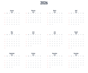 December 2026 calendar. Monthly calendar layout for December 2026. December calendar for 2026 isolated on transparent background.