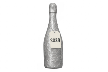 Silver champagne or wine bottle celebrating new year's eve 2028 with transparent background