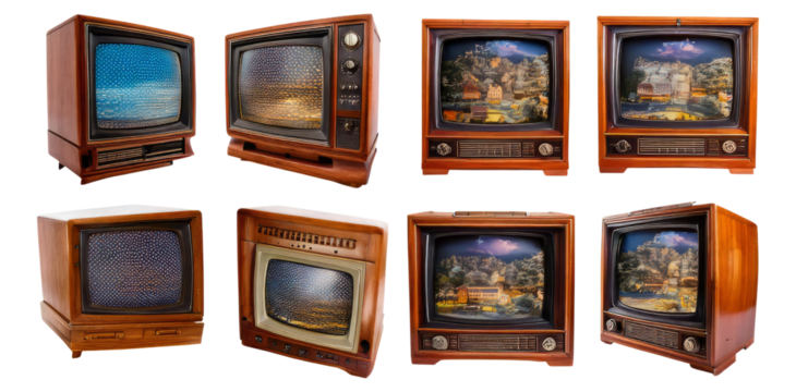 Vintage Television Set Collection with Unique Designs and Colors, Isolated on Transparent, white background