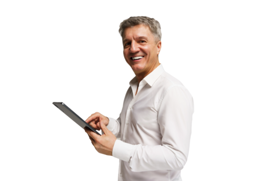 A curious gorilla engages with a tablet in a modern setting, exploring technology in an unusual way isolated on transparent background