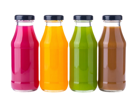 Four glass bottles filled with vibrant, colorful juices on a solid black background
