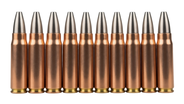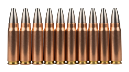 Ten 223 Remington bullets isolated PNG, ammunition for rifles and target practice on transparent background