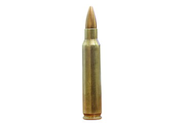 Isolated 5.56mm centerfire rifle cartridge round ammunition, metallic casing, military projectile