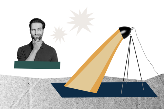 Contemporary poster trend art collage of doubtful man hold chin arrow decision turn pointer direction success promotion strategy