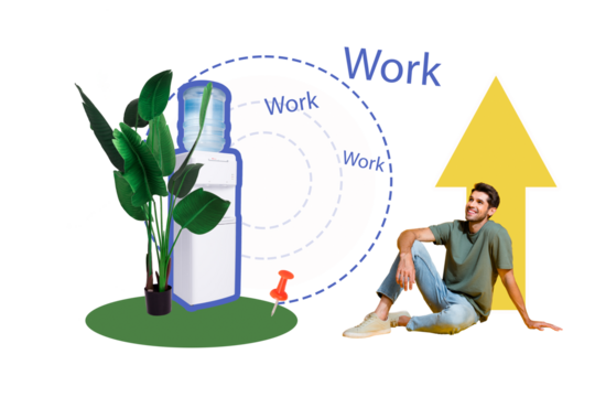 Composite photo collage of happy businessman sit office cooler supply arrow development pointer success isolated on painted background