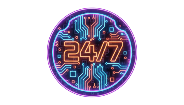 Glowing neon 24/7 service icon with a futuristic circuit board design and vibrant orange, blue, and purple lights representing constant digital availability and technical support