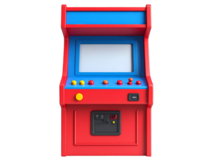 Vibrant Red and Blue Retro Arcade Game Machine Isolated on Black Background, featuring a blank screen and classic controls.