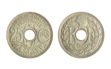 Isolated png photo of 25 French 1939 centimes nickel-bronze coin of Third Republic 1870-1941 on transparent background.