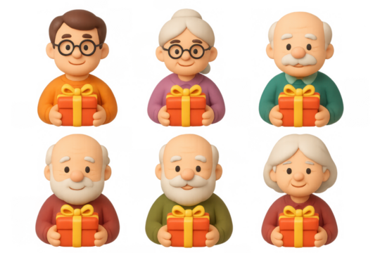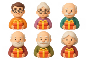 Charming cartoon icons of elderly characters with gift boxes for festive designs and holiday greetings