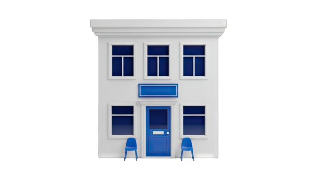 Clean White Two Story Building With Blue Accents And Dark Windows Exterior View On A Transparent Background Minimalist Architecture Style