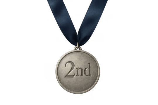 Silver 2nd place medal hanging on blue ribbon for competition runner-up, achievement, and success, transparent background