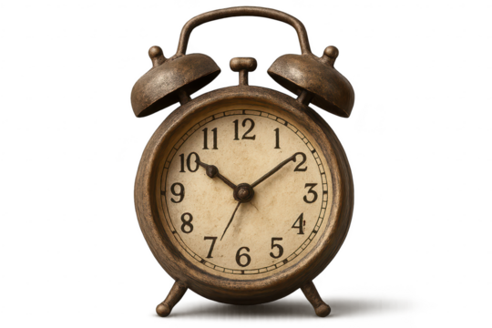 Old alarm clock with transparent background, ticking slowly, aged brass.