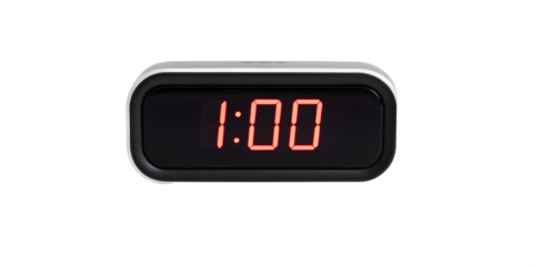 Modern digital alarm clock showing 1:00, glowing LED display, isolated on white background.