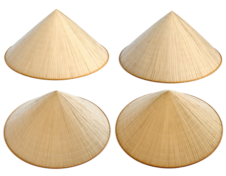 Four conical straw hats arranged in a 2x2 grid on black