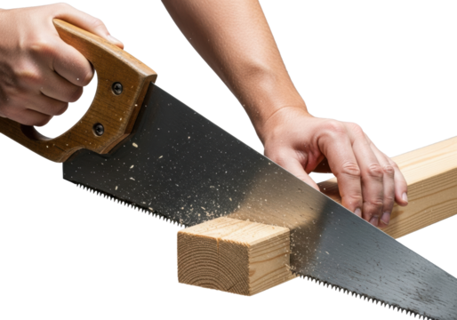 Strong adult hands gripping a manual handsaw cutting unfinished 2x4 timber, hyperdetailed with frozen sawdust, subtle blade motion blur on transparent studio background. Concept of focused