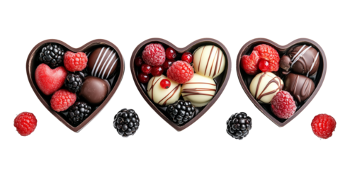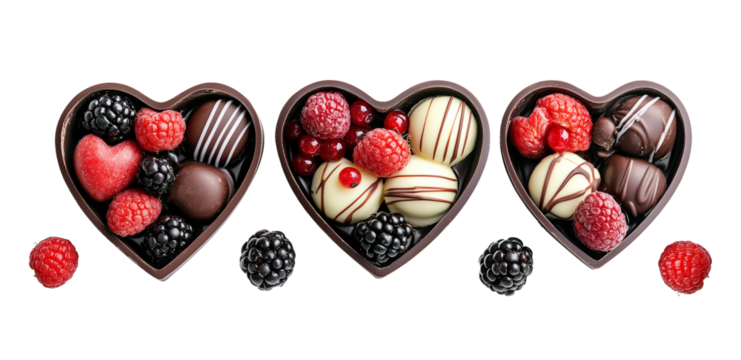 Decorated Valentine's Day candy boxes in a heart-shape with chocolate candies in black and white chocolate with berries. Design elements on the transparent background.