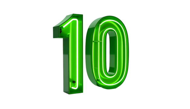 Illuminated 3D rendering featuring the number ten, with a vibrant green neon glow and a dark background