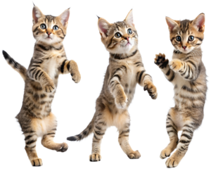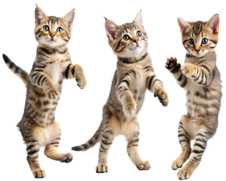 Three cats wearing Santa hats, sitting in a row, isolated on white background. PNG transparent.