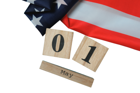 Wooden blocks show May 1 with an American flag for Labor Day, isolated on white, PNG