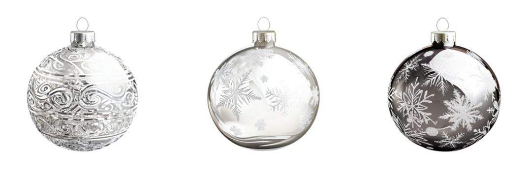 Set of three transparent glass Christmas tree ornaments with a silver pattern, isolated on a white background.  (3)