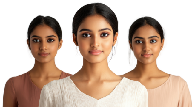 concerned young woman with pastel hair expressing sadness in three poses transparent background