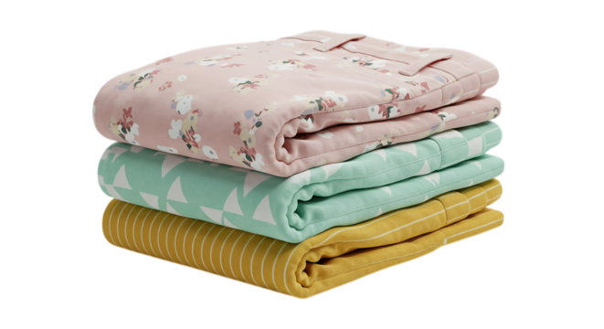 Stack of three folded Pant in pastel colors isolated on transparent background