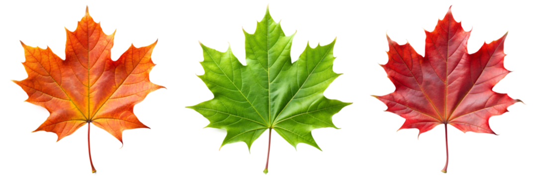 Set of three maple leaves as an autumn symbol isolated on a transparent background