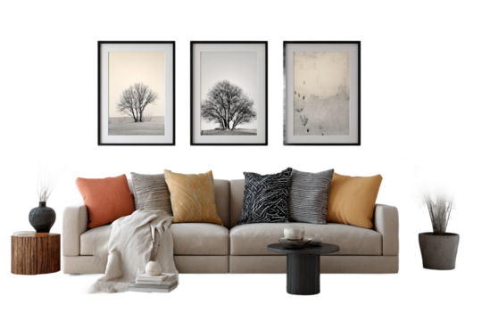 Gallery-style 3 art print set on neutral wall isolated on transparent background