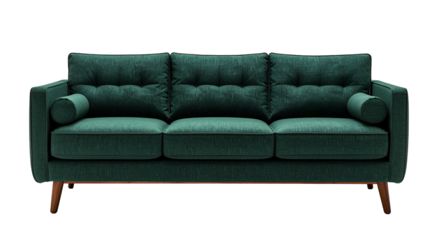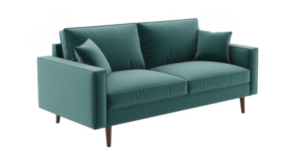 Modern teal velvet sofa with wooden legs isolated on transparent background