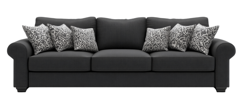 Comfortable three seater sofa with patterned cushions isolated on transparent background