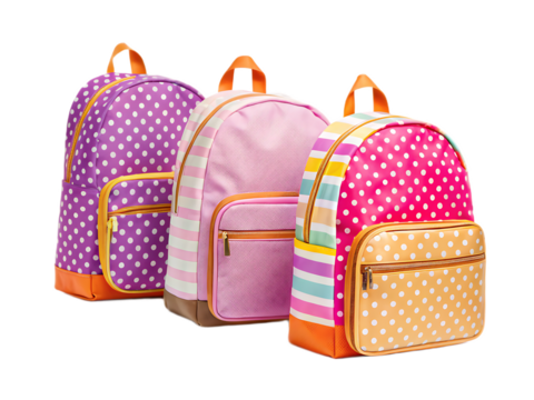 Three colorful backpacks with different designs standing in a row against black background