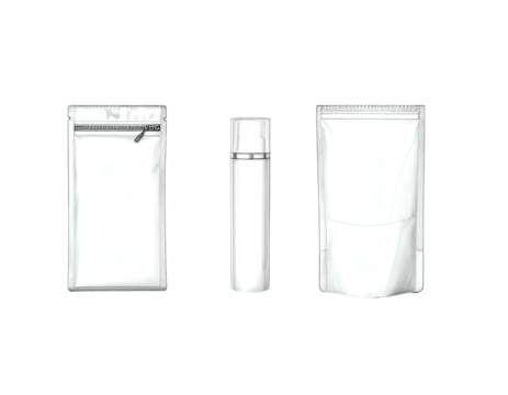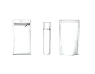 Three white packaging examples pouch with zipper, a bottle, and a stand-up bag