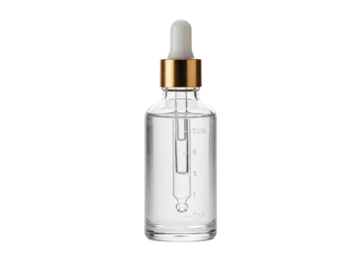 Clear glass dropper bottle with golden cap isolated, cosmetic serum or essential oil bottle on transparent background PNG