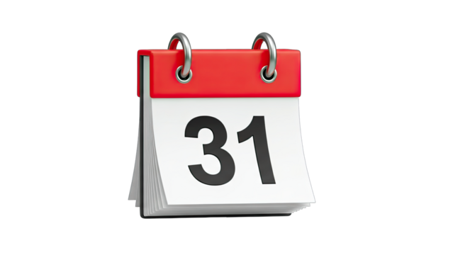 3D Calendar page with number 31 on transparent background