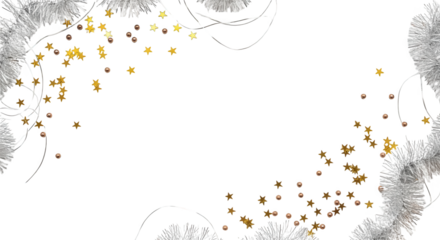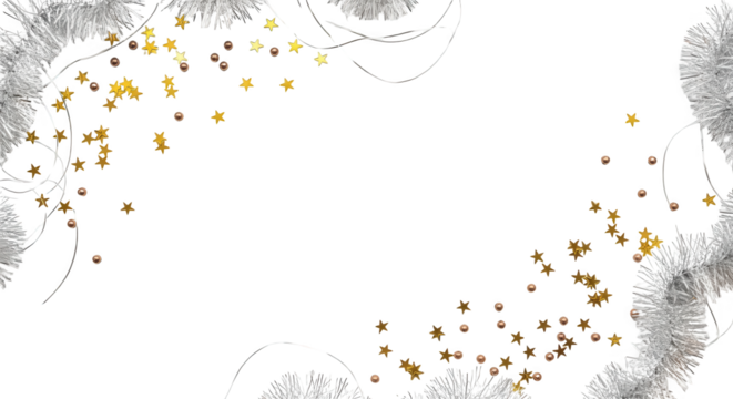 Festive silver tinsel and golden star confetti scattered with small copper beads and thin white strings stars celebration holiday Christmas new year party transparent background