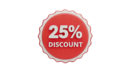 Red discount tag featuring 25 percent off in bold white text on transparent background, PNG