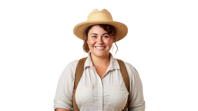 Chubby female farmer, 35 years old, looking at the camera and smiling, isolated on transparent and white background.PNG image.
