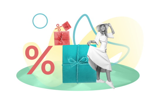 Poster banner collage of amazed lady impressed season summer bargains special offer for tourist