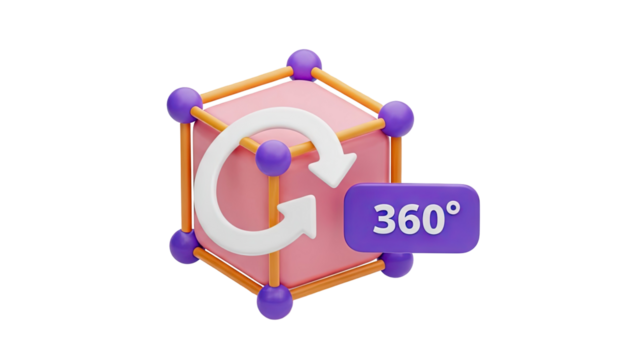 3D 360 Degree Rotation Icon with 3D Cube and Arrows on transparent background