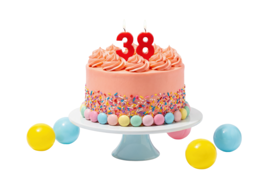 Pink Birthday Cake with Red Number 38 Candles and Sprinkles on White Background