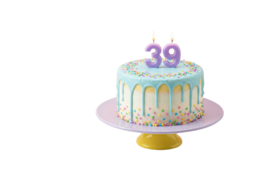 39th Birthday Cake with Blue Drip Icing and Sprinkles on Cake Stand