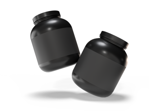 Whey protein and mass gain plastic jar, bottle packaging mockup 3d glossy plastic design. Fitness nutrition canister design template for pill capsule cylinder, vitamins. Supplement gym and workout