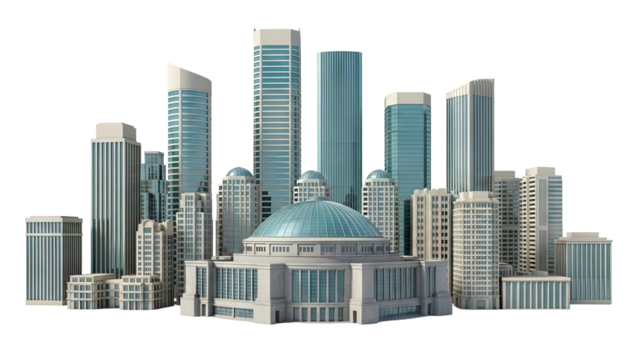 3D financial district skyscraper distinguished by a tall, elegant spire and classic proportions.  Isolated on transparent background.