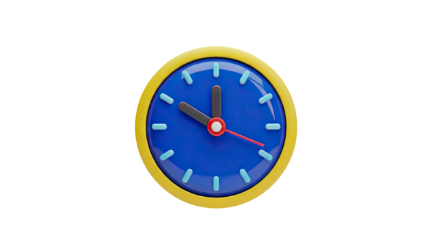 3D Cartoon Clock with Blue Face and Yellow Bezel on transparent background