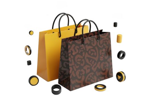 3d illustration of two shopping bags, one yellow and one patterned brown, isolated on transparent background