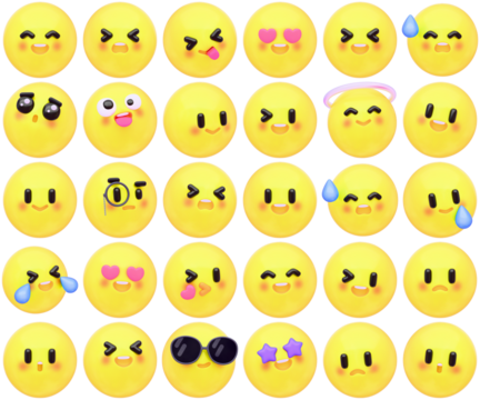 expressive 3d render emoji icon set featuring various yellow facial expressions, isolated on a transparent background, for digital communication.