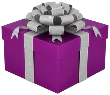 Purple gift box with silver glitter ribbon and large bow on transparent background
