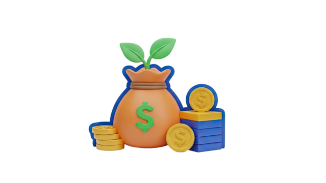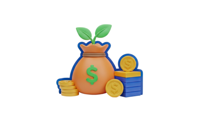 3D Money bag with dollar sign and growing plant, coins and stacks on transparent background