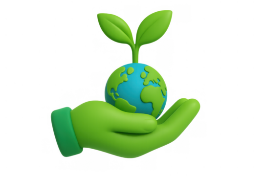 Green 3d hand cradling a blue and green earth globe with a small plant sprouting, representing global environmental care