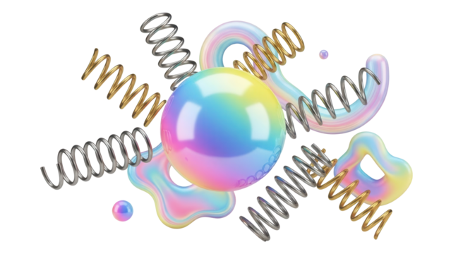 3d shapes, geometric isolated figures. Sphere, springs, abstract modern playful 3d rendering design elements